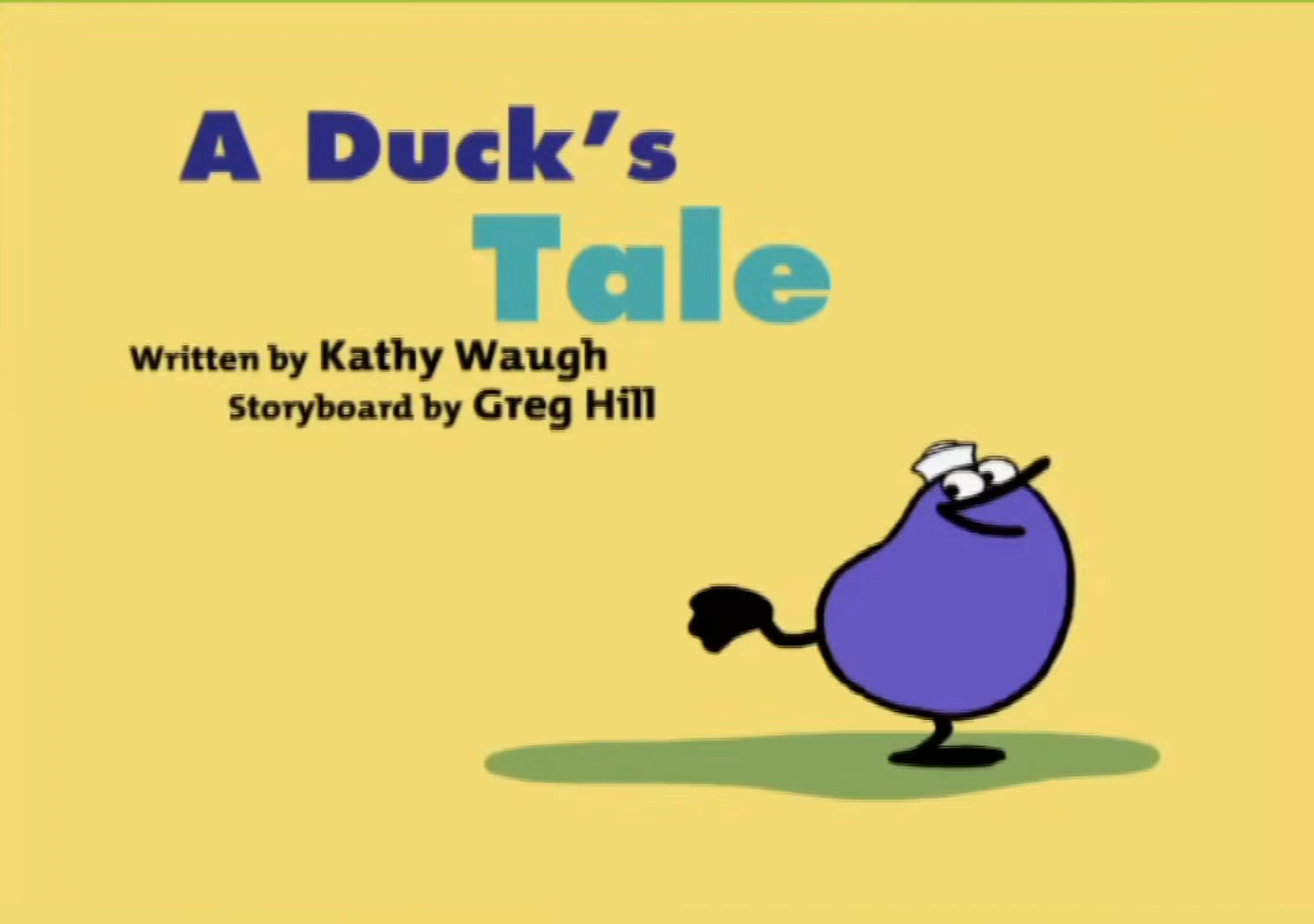 The title card depicts Quack standing on one foot on green ground, smiling, lifting his other foot up behind him, and wiggling it in imitation of a tail. On a pale yellow background the words "A Duck's Tale" are placed near the top near the top left corner with "A Duck's" being in dark blue text. "Tale" is placed below it and in slightly larger light blue text but placed more towards the middle of the title card. Placed beneath "Tale" is, in black text, "Written by Kathy Waugh" over top of "Storyboard by Greg Hill" which is also in black text.